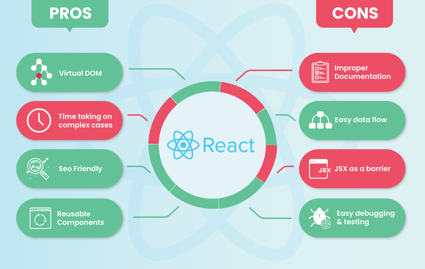 • Usability- Deploying React is fairly easy to accomplish if you have some basic knowledge of JavaScript.